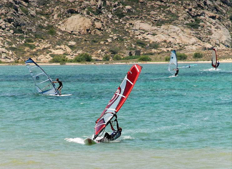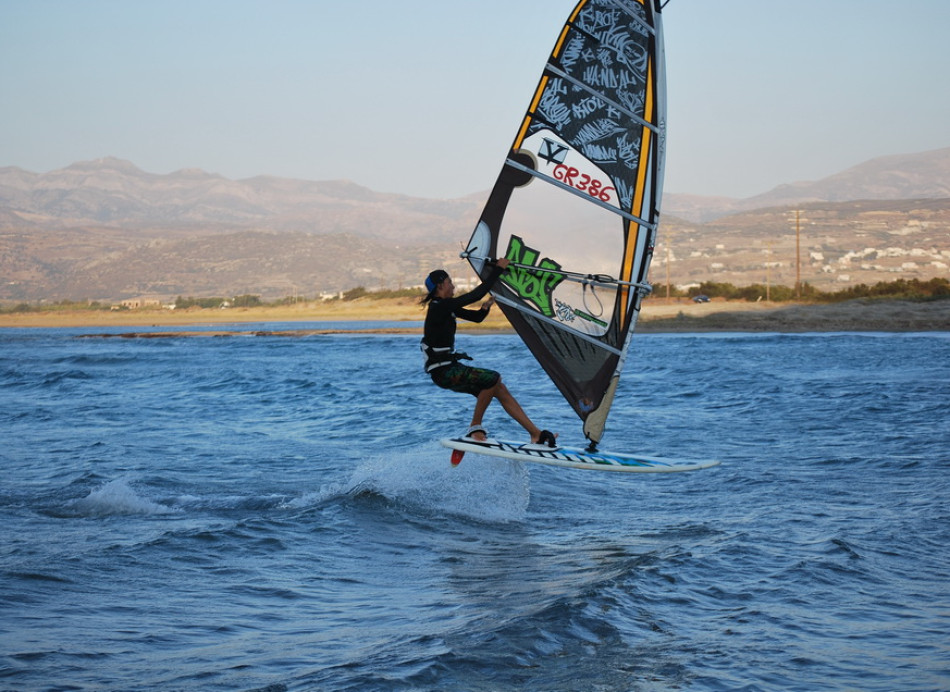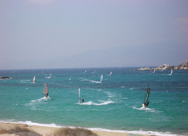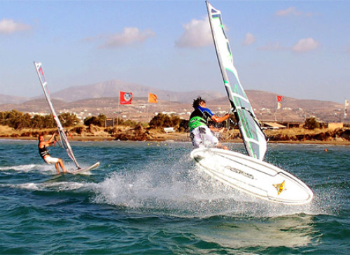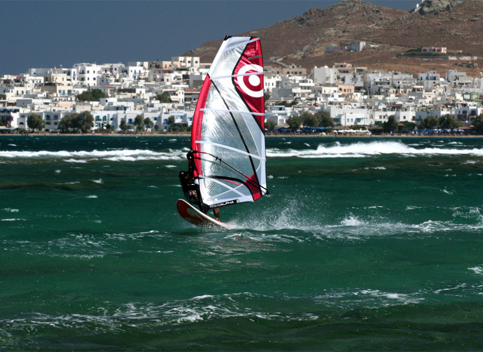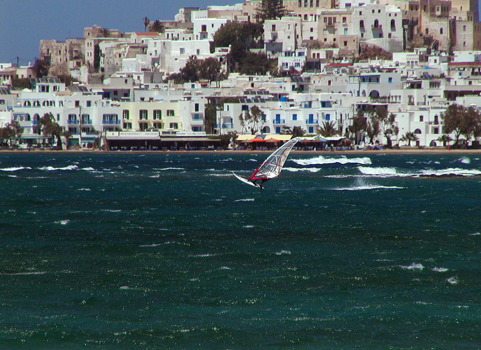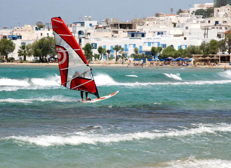 Naxos oferuje niezłe warunki do uprawiania sportów wodnych, ponieważ wybrzeże od zachodu jest dość płaskie, co powoduje, że wieje dość równo i mocno. Najlepsze warunki panują między czerwcem a wrześniem – minimum 4 Bft (co najmniej 80 procent dni) aż do 8.
